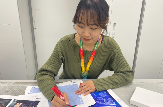 アートワークのラフがあがったら、実際にテスト印刷して紙で確認します。文字要素や写真の色合いなど、実際に刷ってみないとわからないことが多々あるため、テスト印刷は欠かせない工程です。